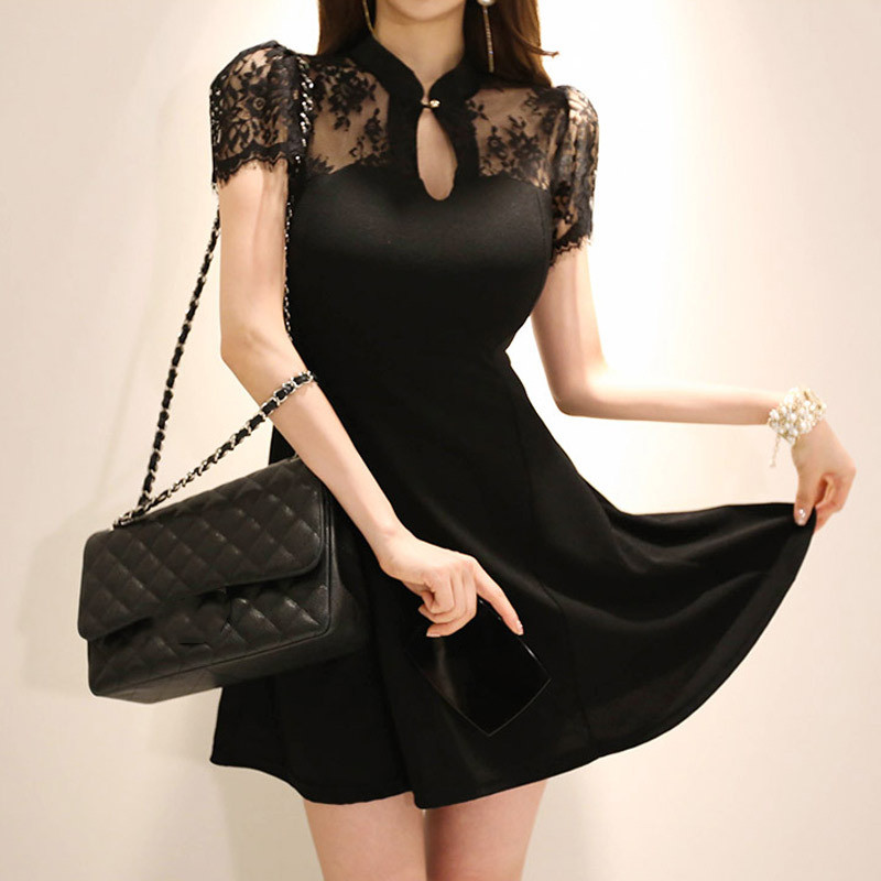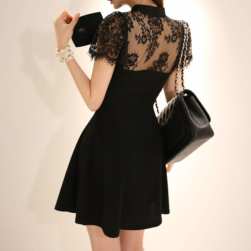 袖のシースルーレース刺繍が上品で可愛い黒ドレス。
