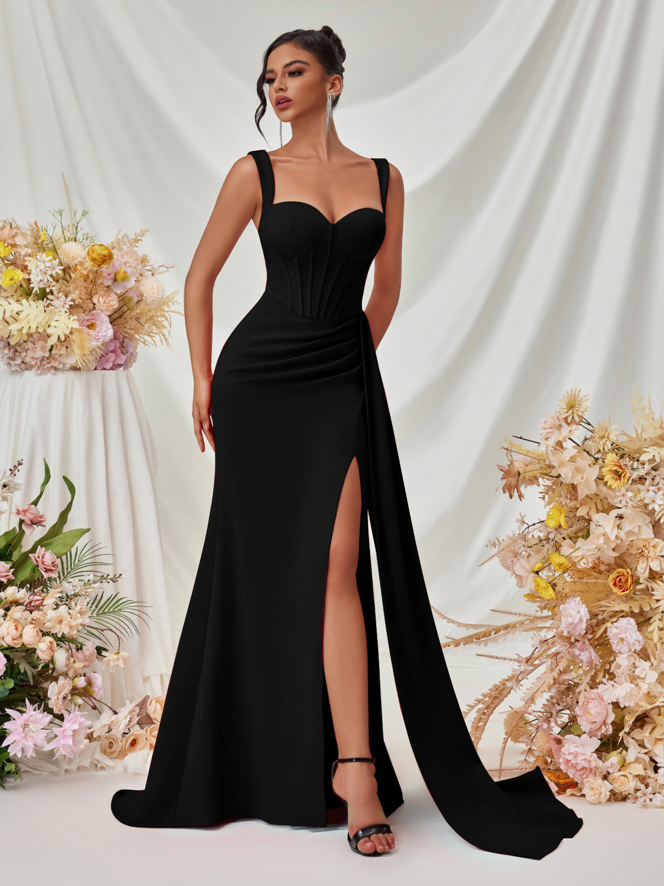 胸元を美しく見せるハートネックのビスチェデザインが印象的な黒ドレスです。