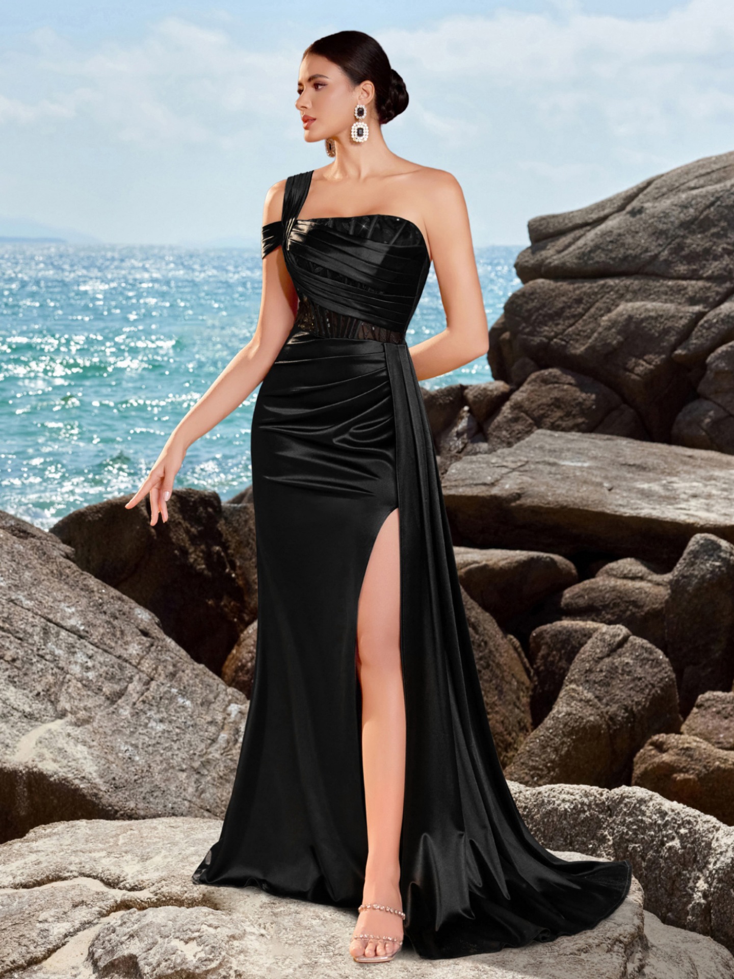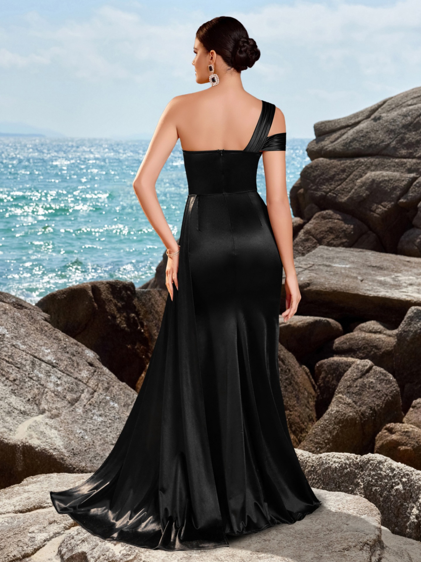 片肩を美しく見せるアシンメトリーなデザインで、モダンで都会的な雰囲気