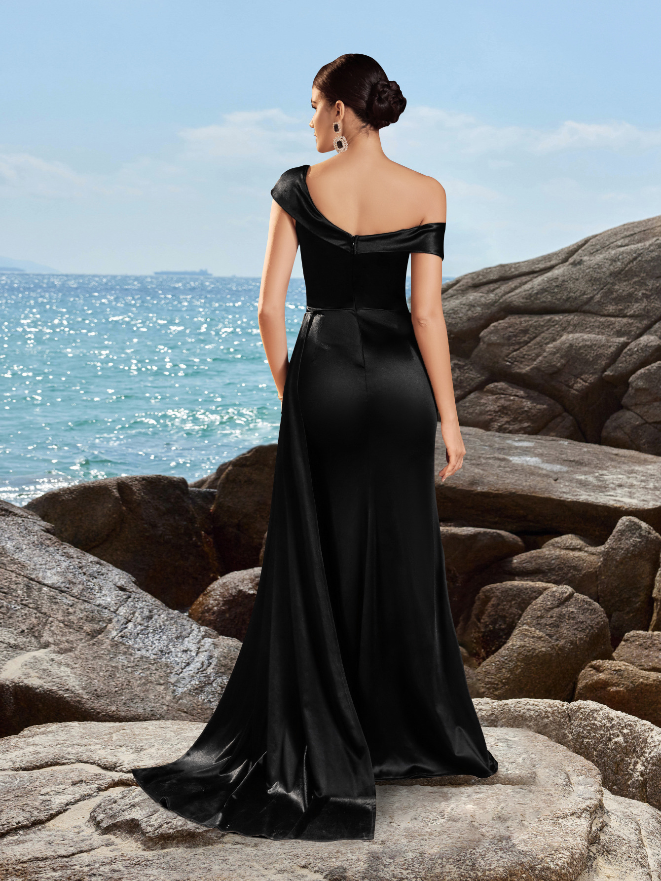 華やかなワンショルダーデザインが印象的な黒ドレスです。 光沢感のあるサテン生地を贅沢に使用し、身体のラインを美しく見せるドレープ加工が施されています。 マキシ丈の裾まで流れる優雅なシルエットに、サイドの深いスリットがアクセントを添え、歩くたびに女性らしさを演出します。 結婚式やパーティー、特別な日の装いに最適な一着です。