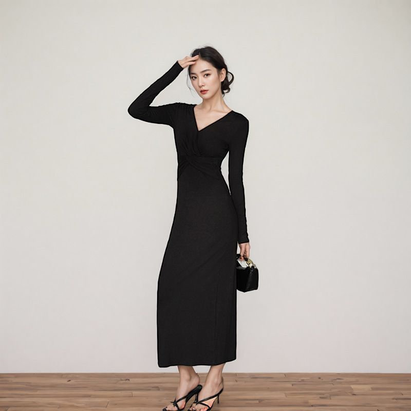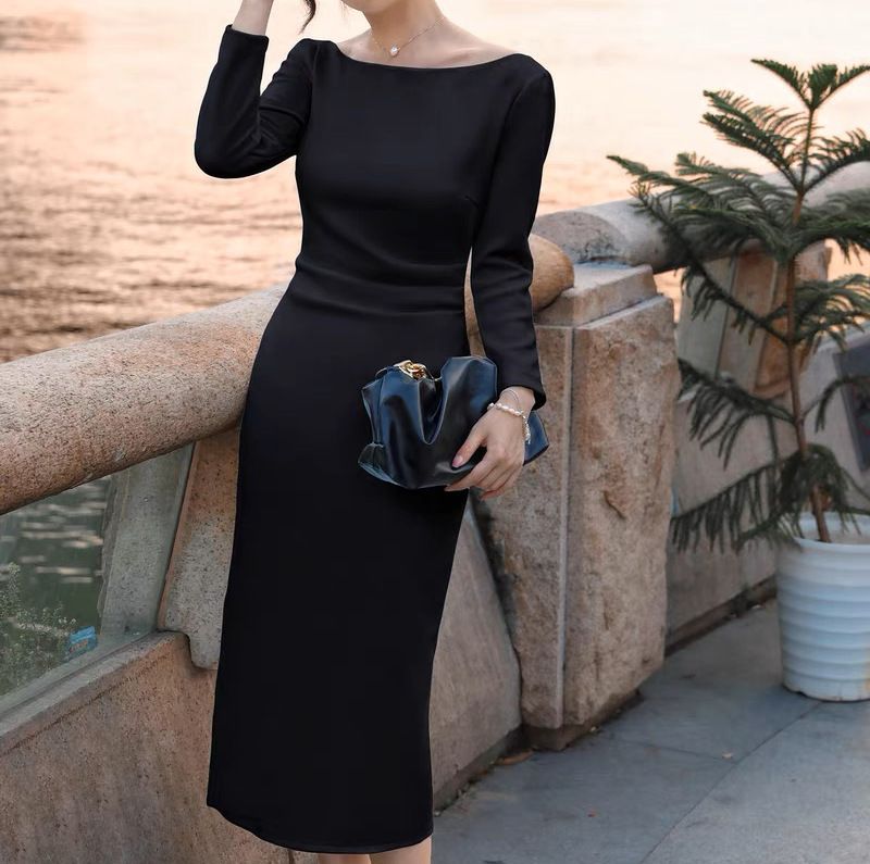 洗練されたシンプルなロング丈黒ドレス。オフショルダーが肩を引き立て、すっきりとしたシルエットでエレガントさを加えます。柔らかな素材が心地よい着用感を提供し、特別なシーンにもぴったりの一着。美しさと快適さを兼ね備えたこのドレスは、あなたのスタイルを引き立てること間違いなしです。