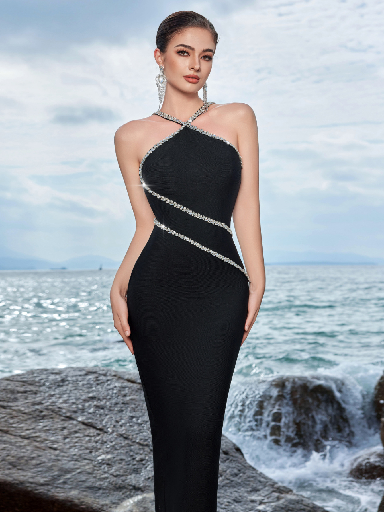 クロスホルターネックデザインが首元から肩にかけて美しいラインを描き、体のラインを綺麗に見せるボディコンシルエットが魅力的です。