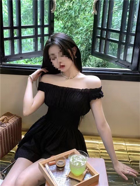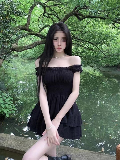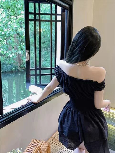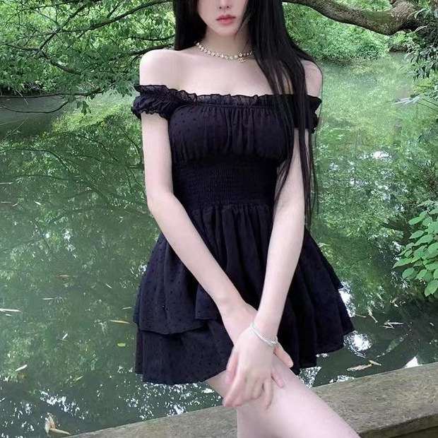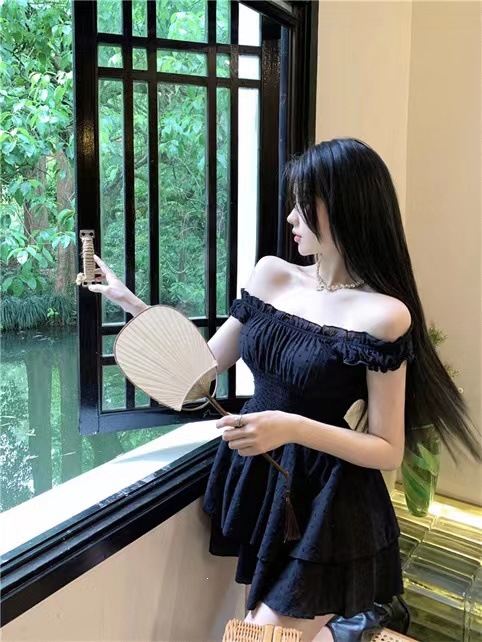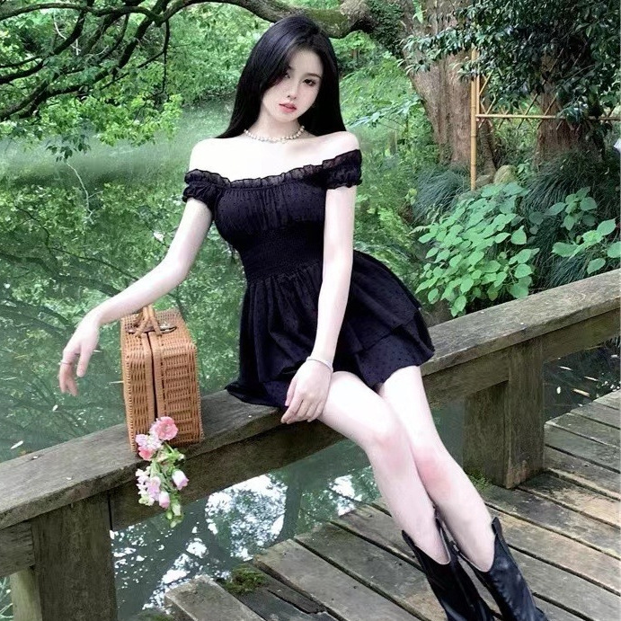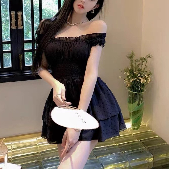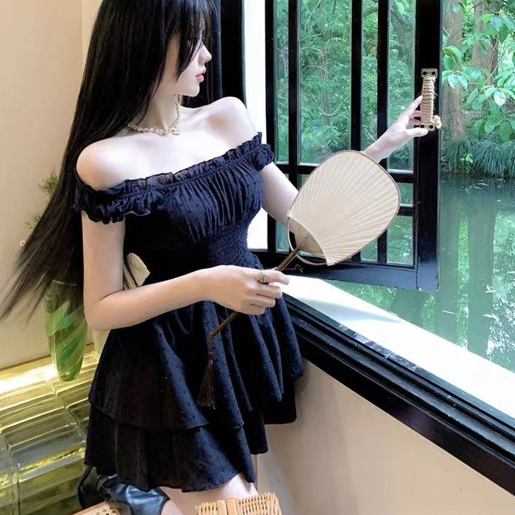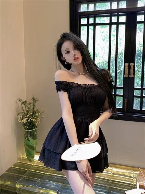 華やかなオフショルダーデザインが魅力の黒ドレスです。