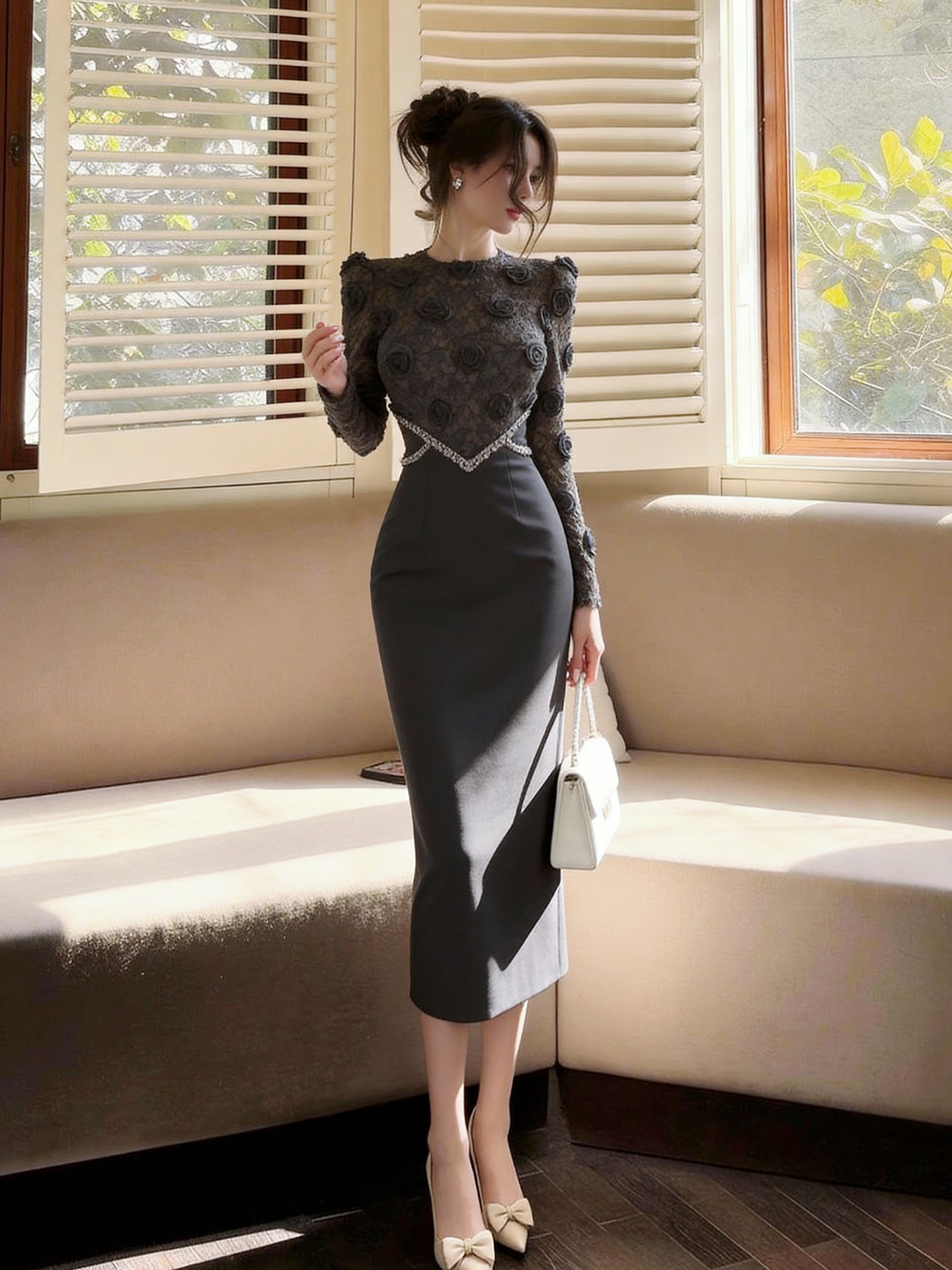 ミディアム丈のシルエットが上品で、パーティーや特別なディナーシーンにぴったりです。