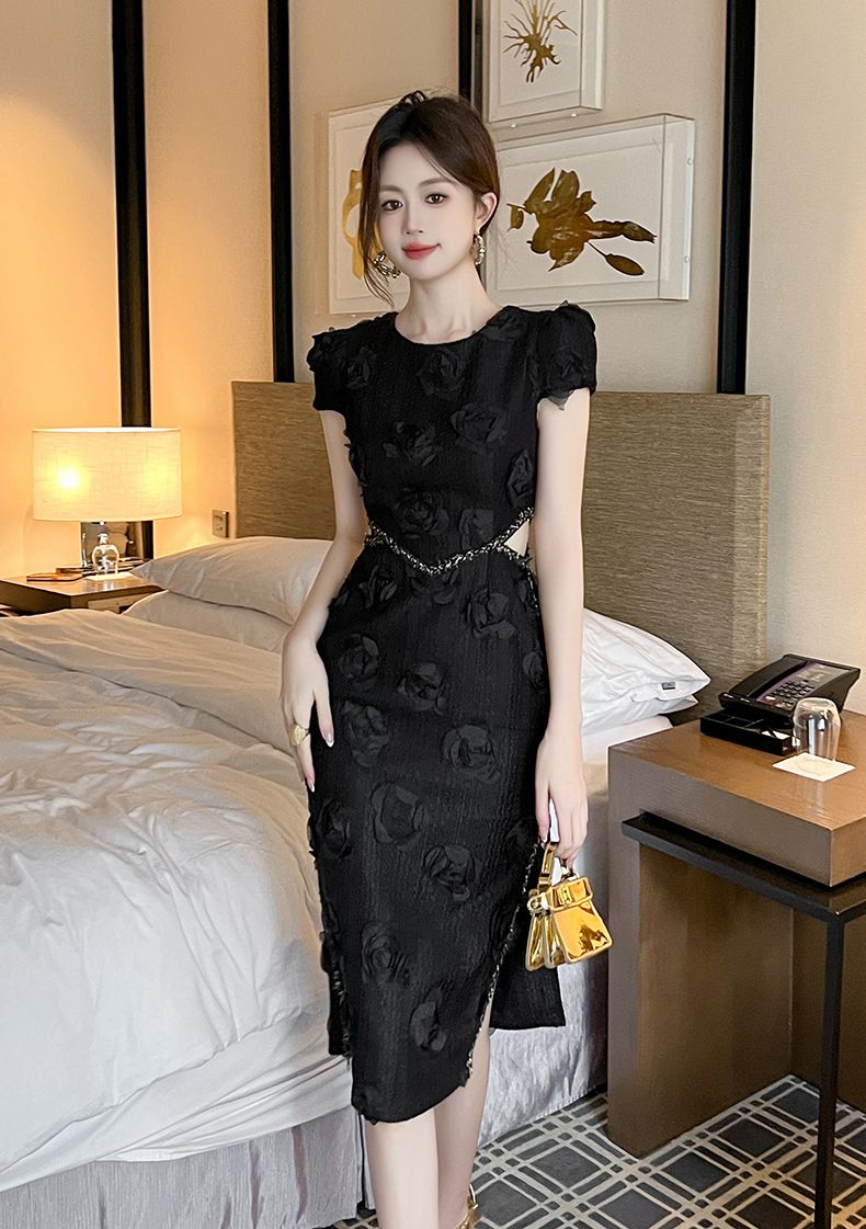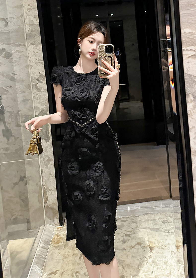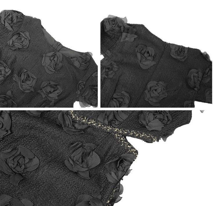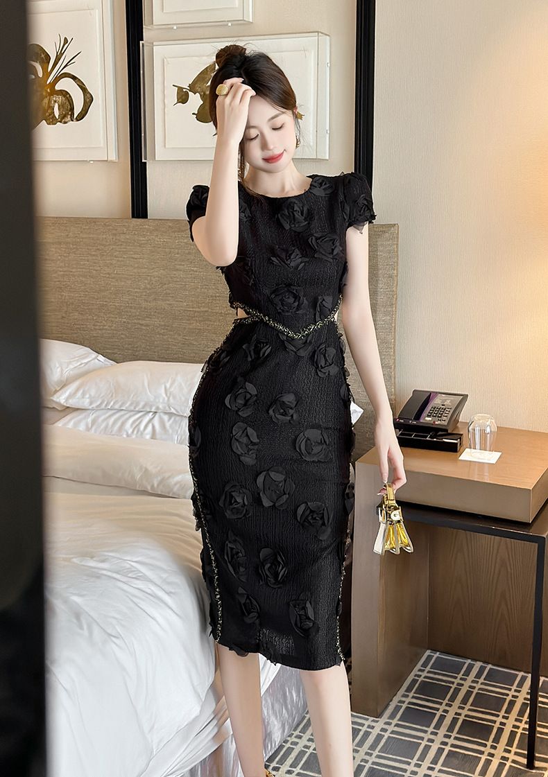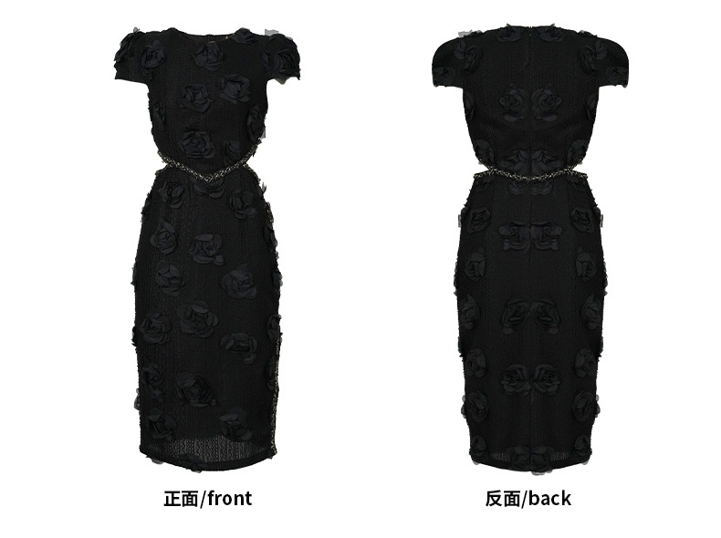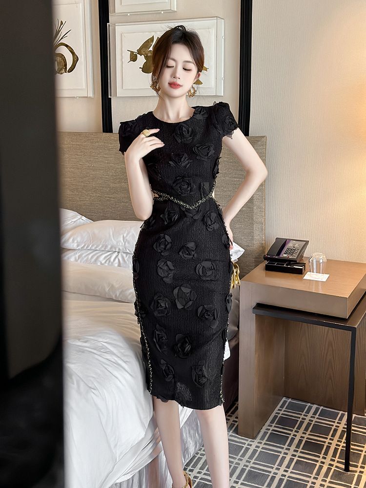 華やかな立体花モチーフが全体に散りばめられた上品な黒ドレスです。