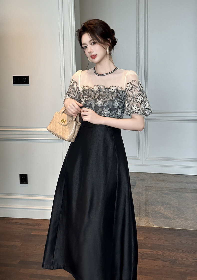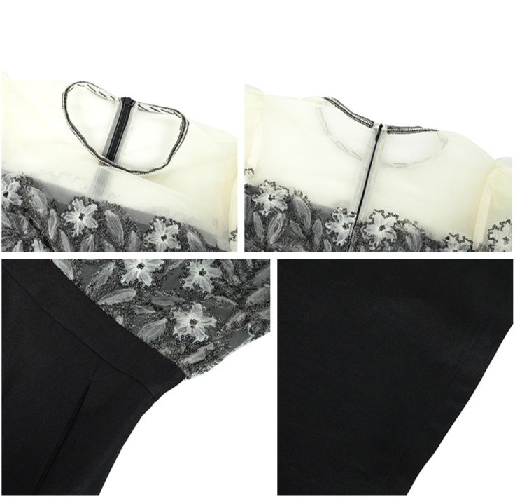 透け感のある袖部分には繊細な刺繍が施され、上品で女性らしい印象を与えます。