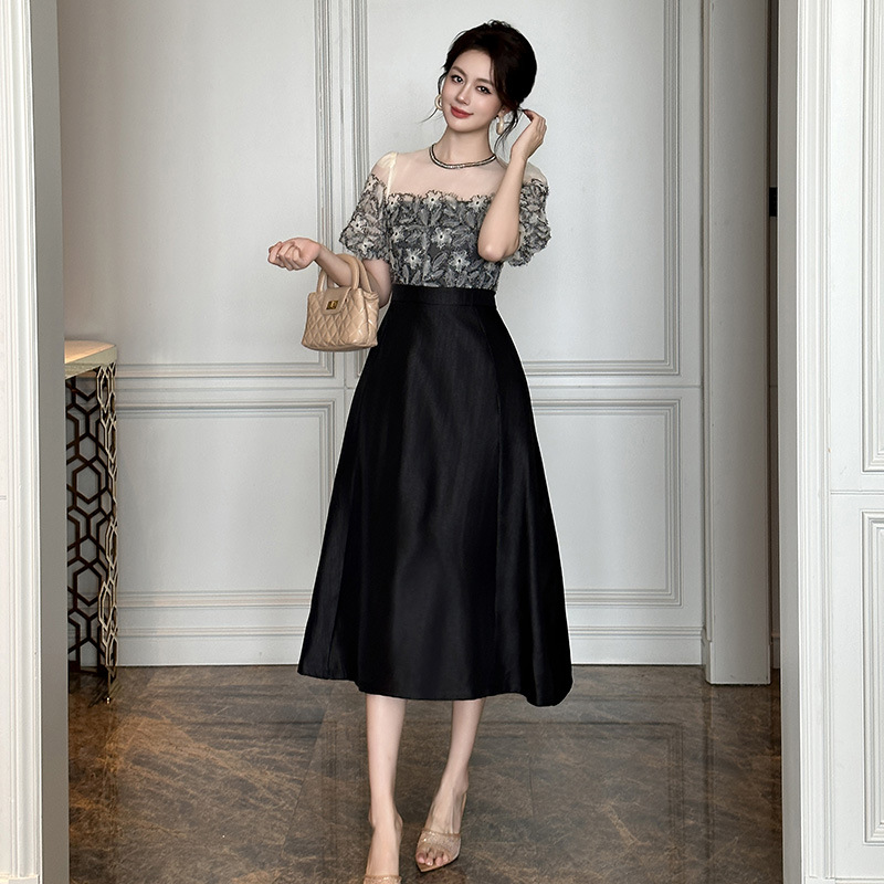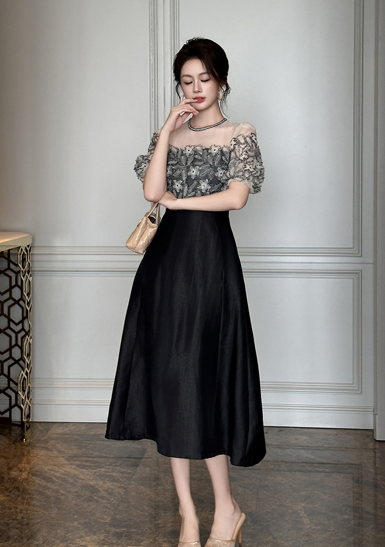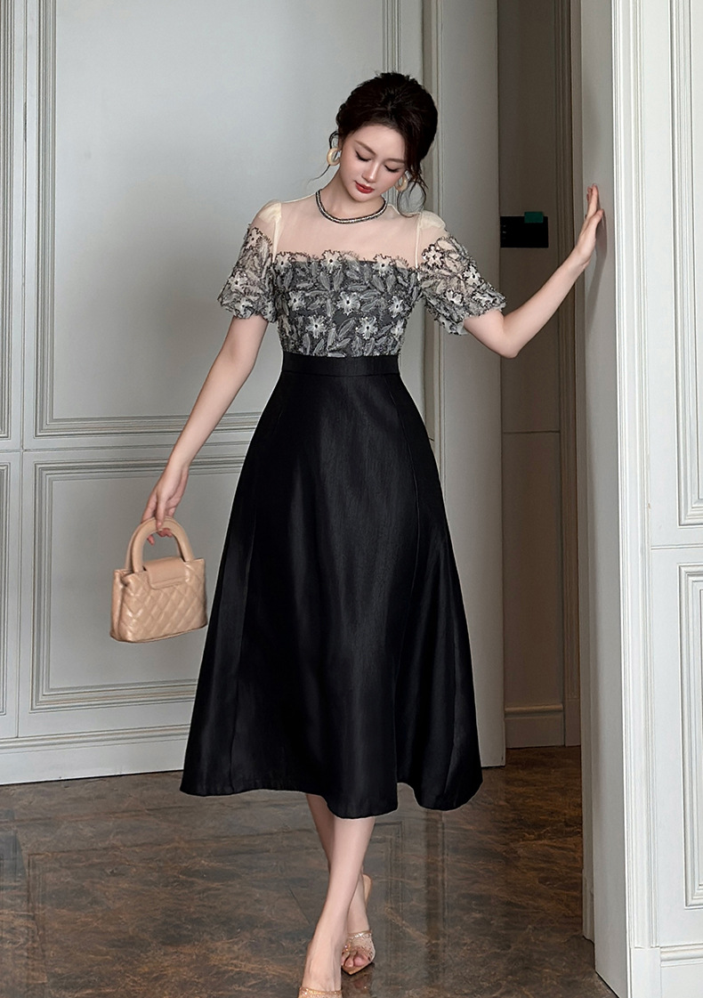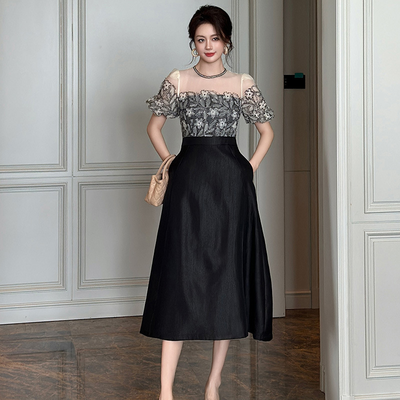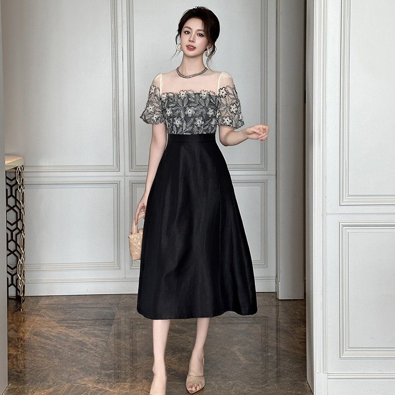 華やかな花柄刺繍が施されたオフショルダーデザインの黒ドレスです。