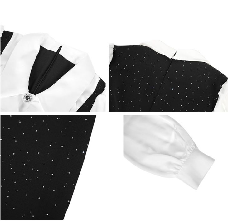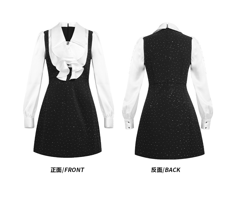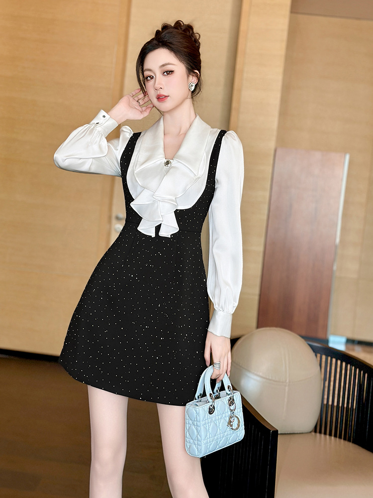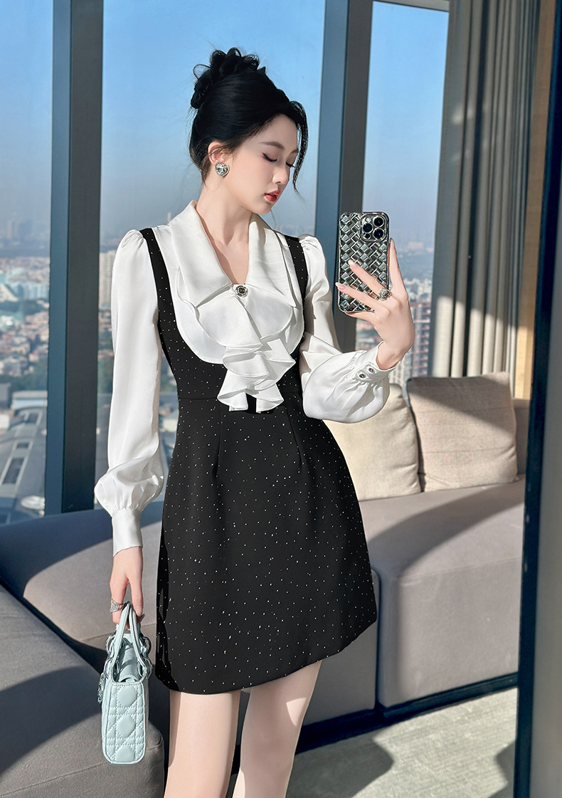 白のボリューム袖ブラウスが上品さを演出し、黒ドレスのジャンパースカートが大人の可愛らしさを引き立てます。