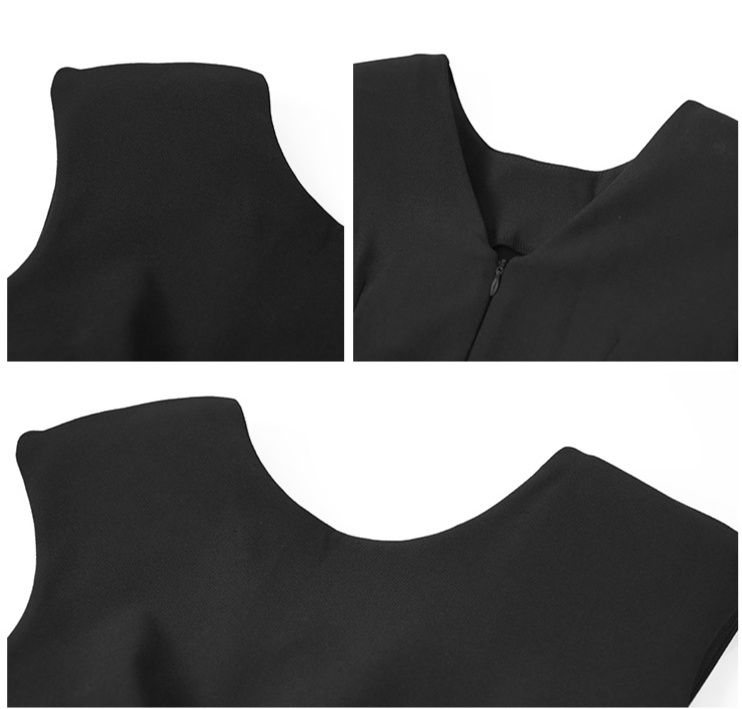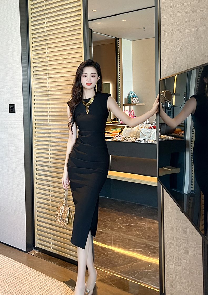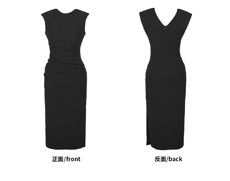 ノースリーブのすっきりとしたデザインに、体のラインを美しく見せるタイトシルエットが魅力的です。