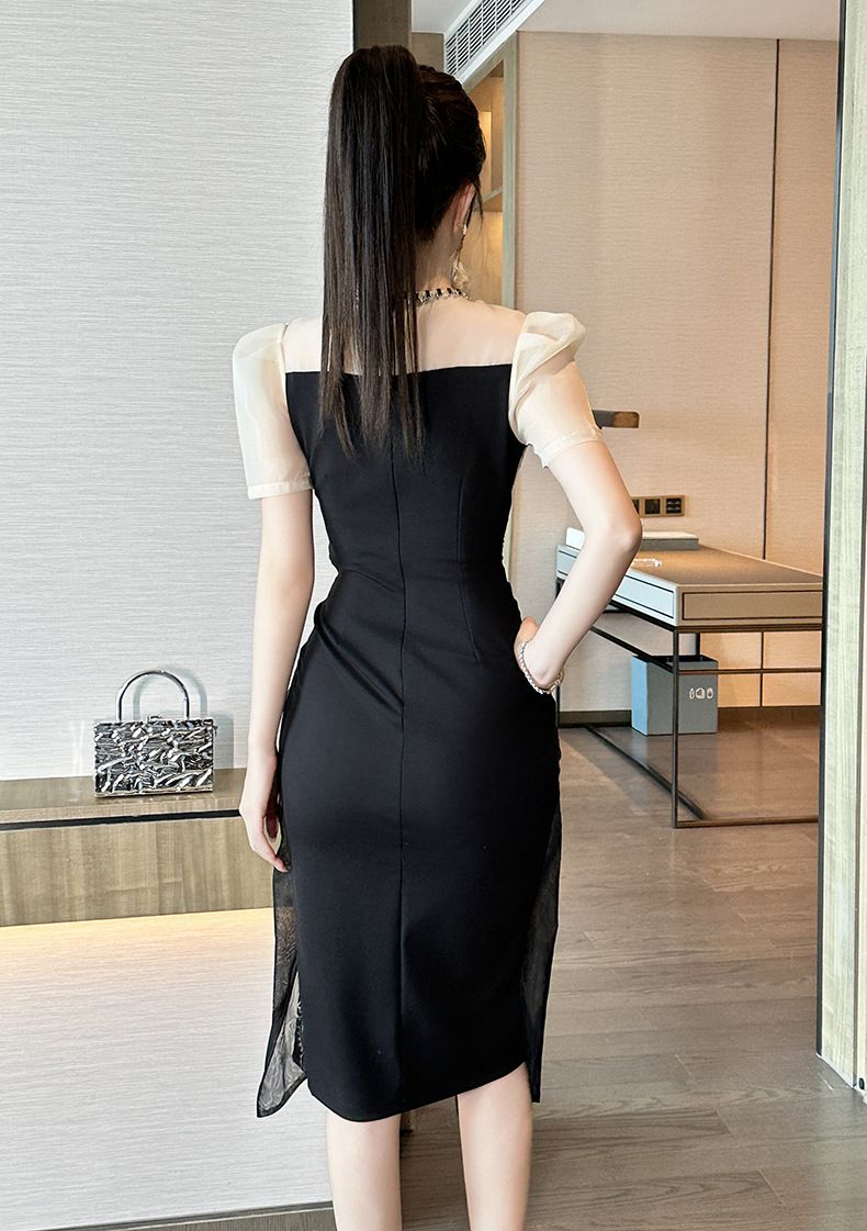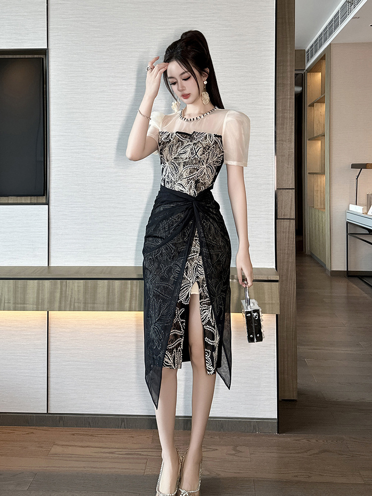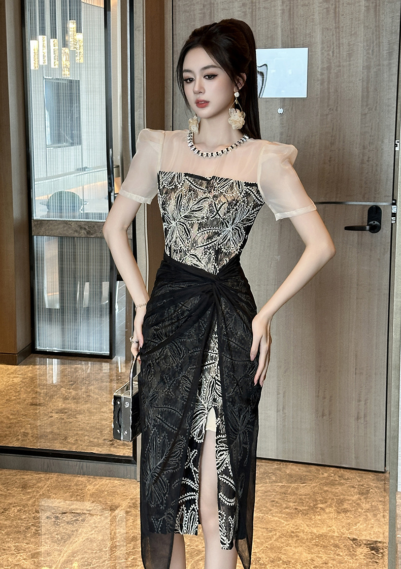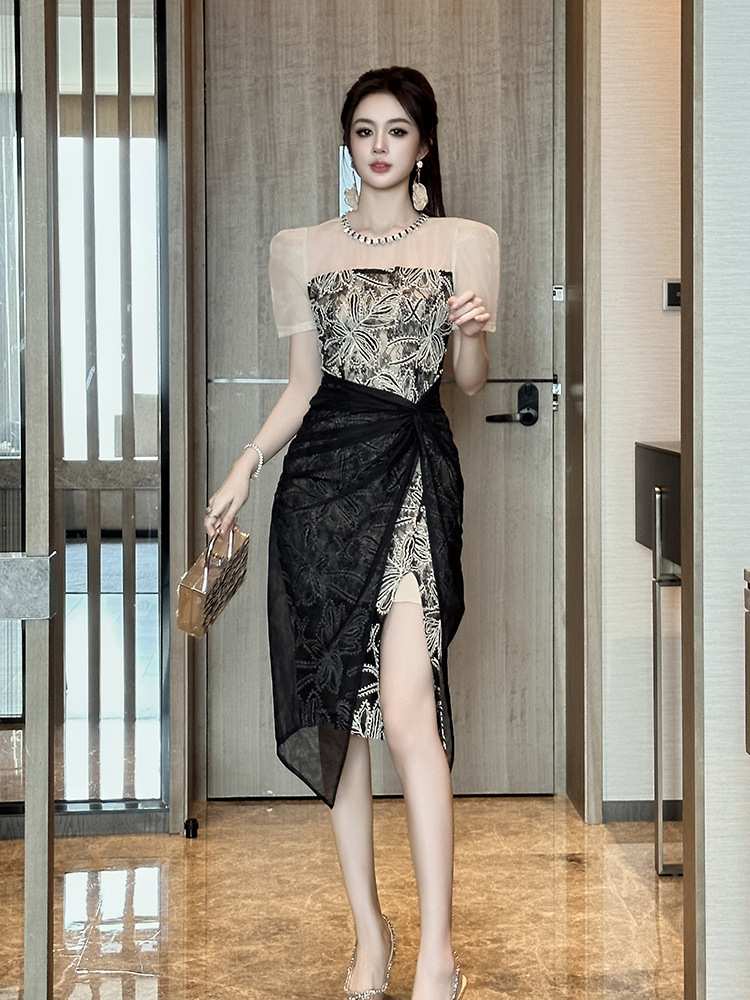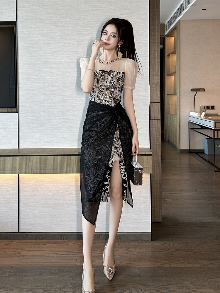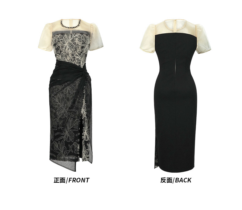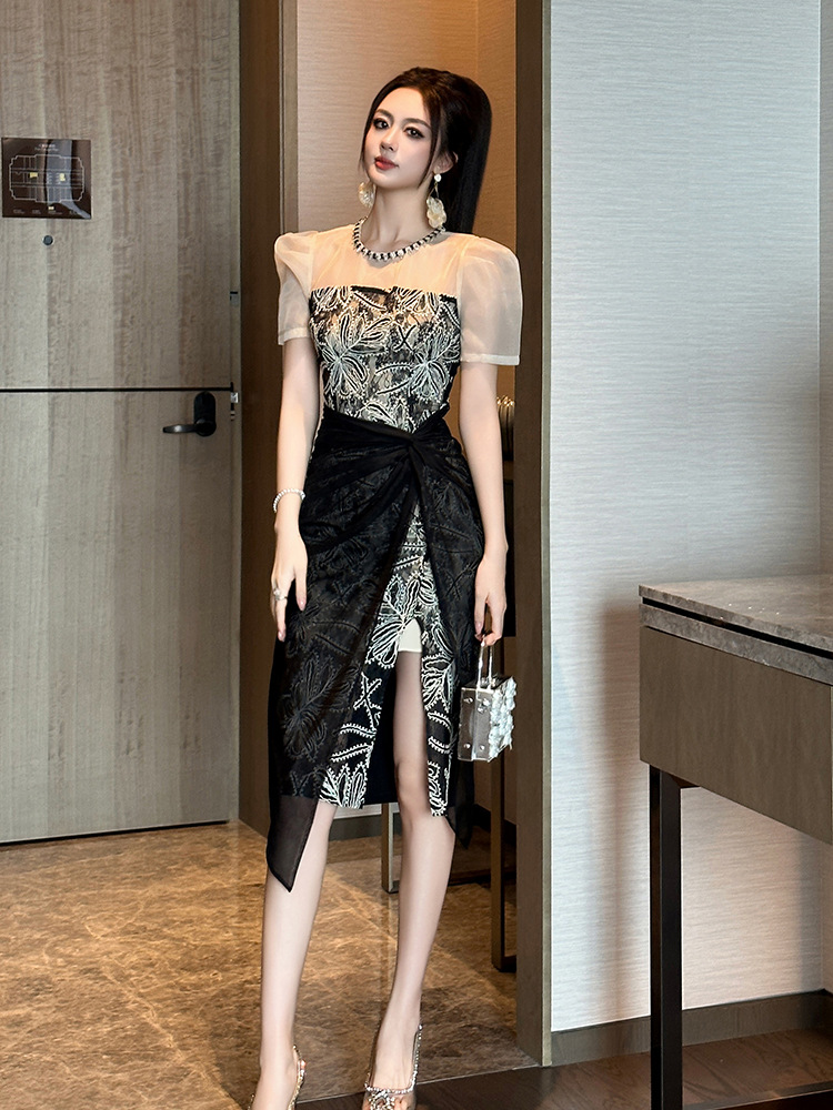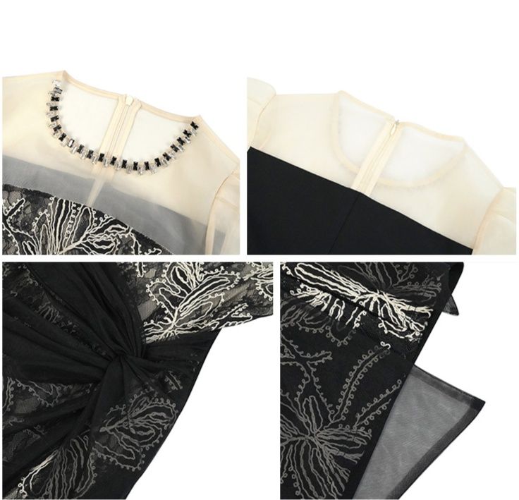 華やかな刺繍レースとシアー素材を組み合わせた黒ドレスです。