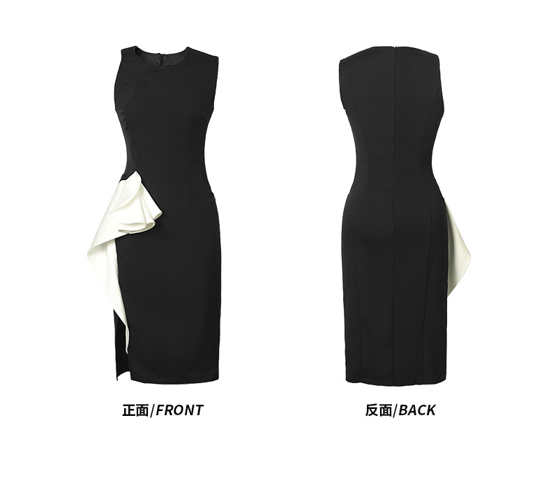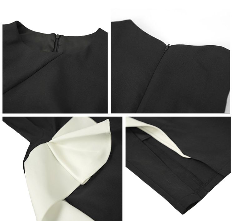 洗練された黒ドレスに白の非対称フリルがアクセントとなったミディアム丈のワンピースです。