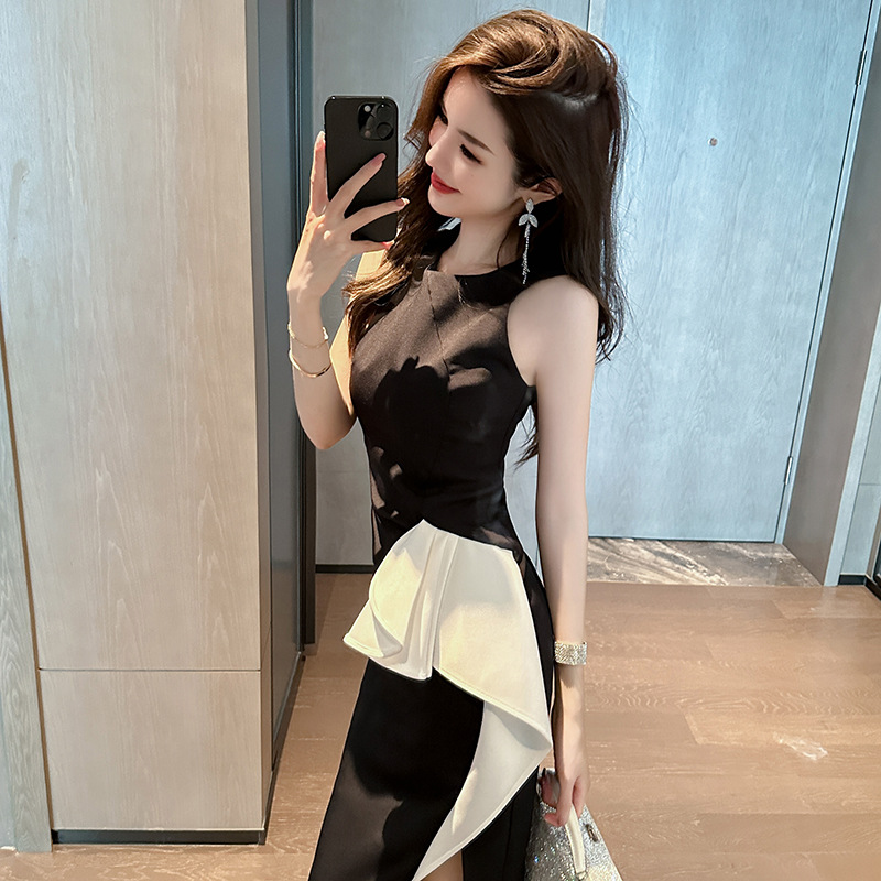 ノースリーブのすっきりとしたデザインと、サイドのスリットが女性らしい上品な印象を演出します。