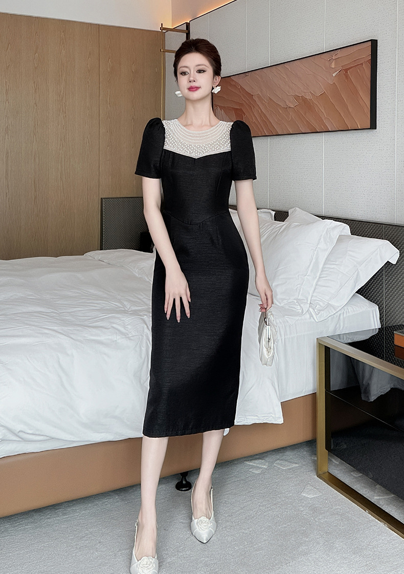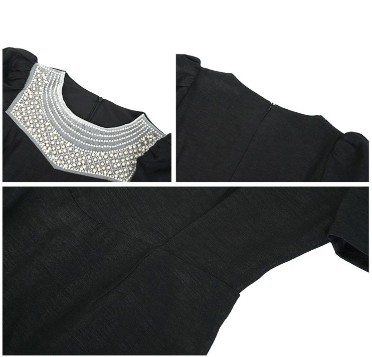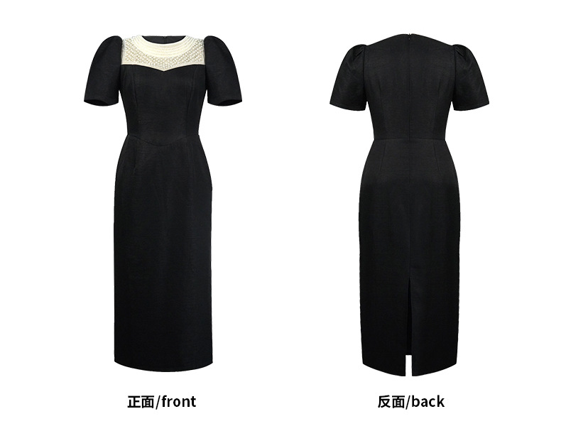 胸元のパール刺繍が華やかさを演出する黒ドレスです。