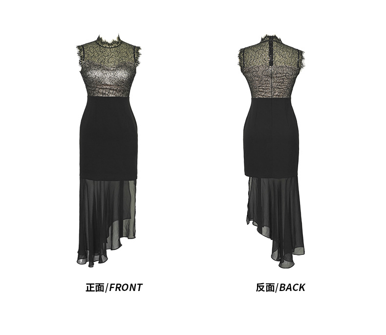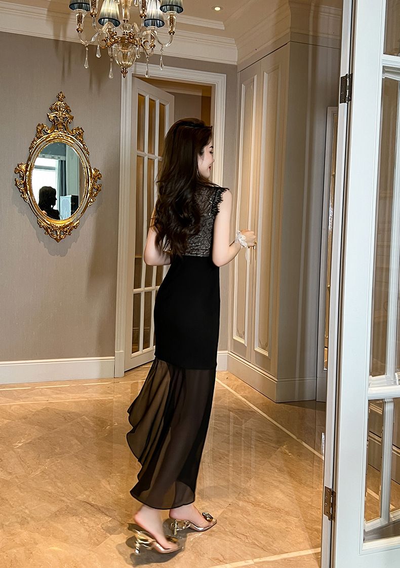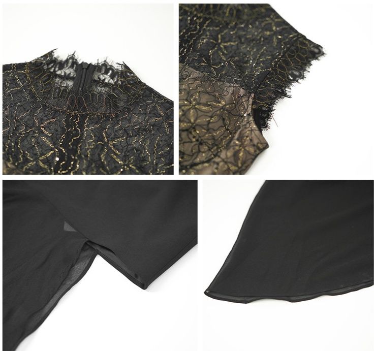 上品な花柄レースのトップスと透け感のある裾が魅力的な黒ドレスです。