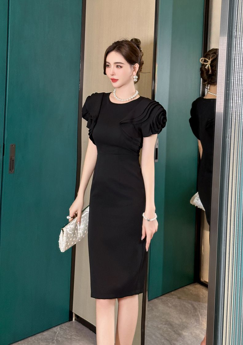 ミディアム丈のタイトシルエットが女性らしいボディラインを美しく引き立て、結婚式やパーティーなど特別な日にぴったりです。