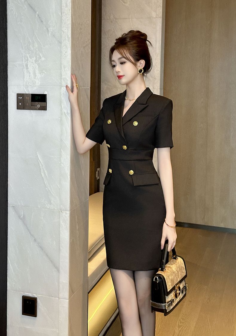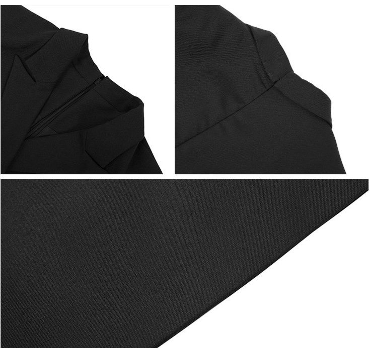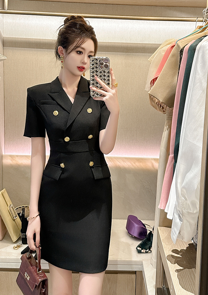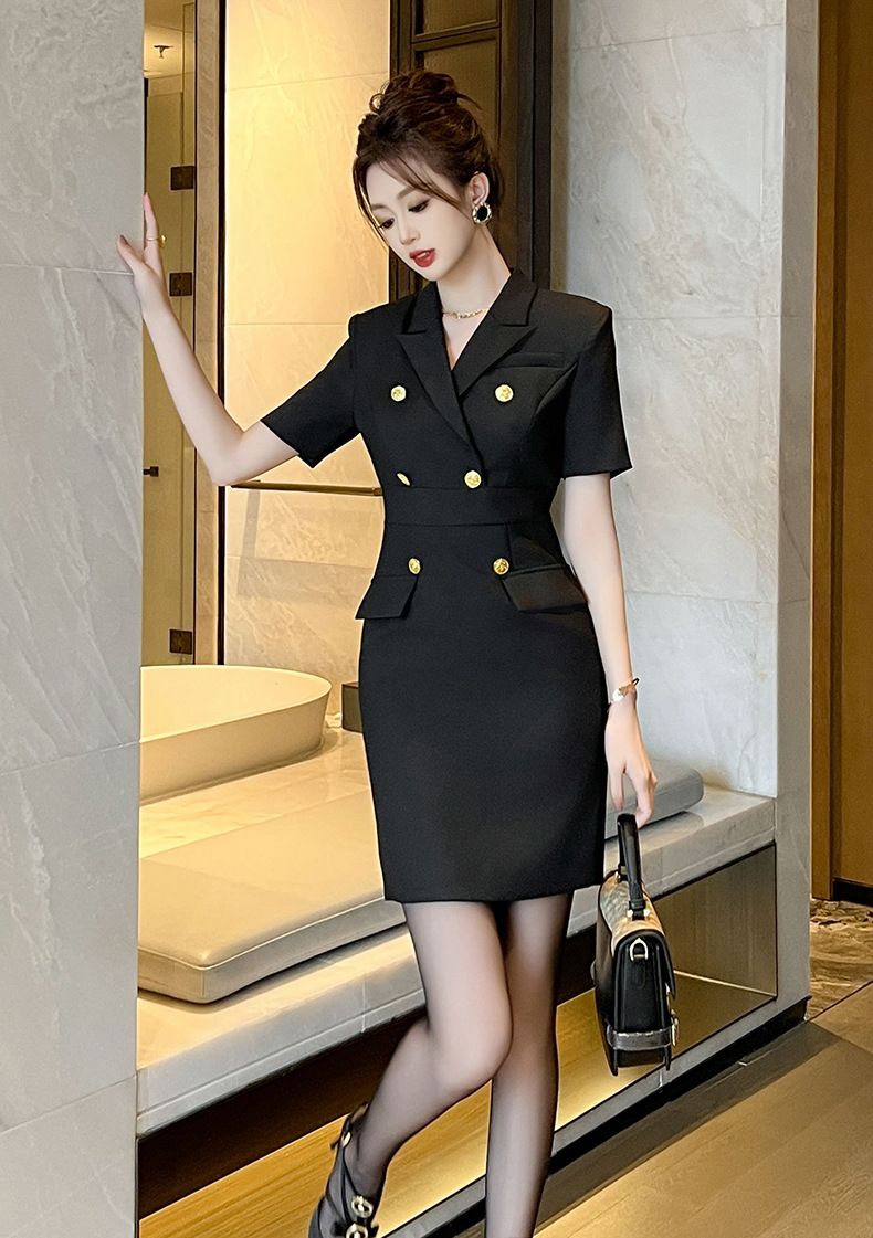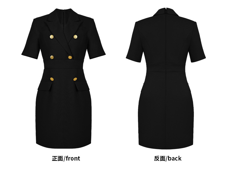 テーラードジャケットのようなデザインが特徴の黒ドレスです。