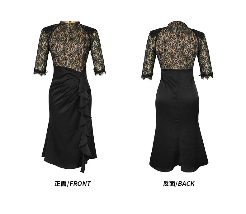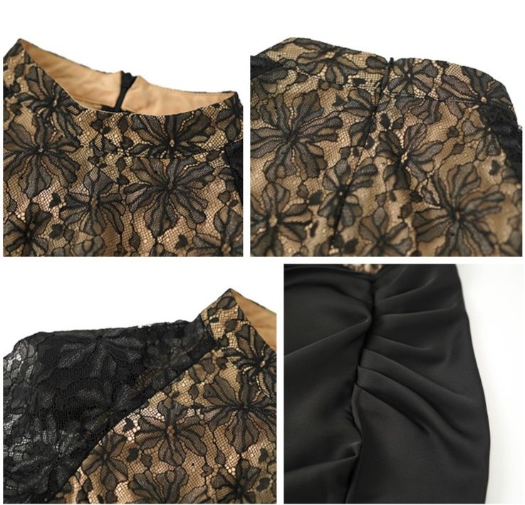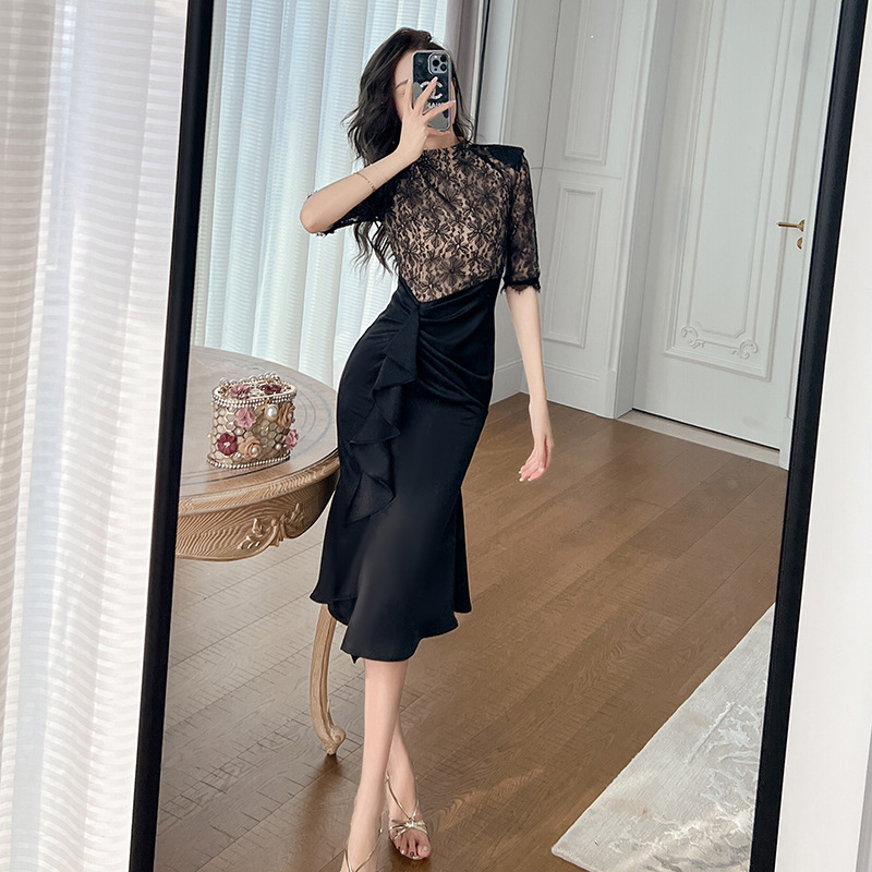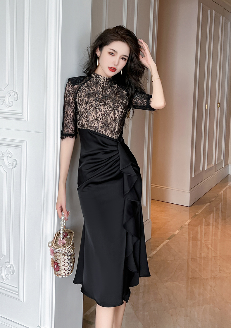 繊細な花柄レースのトップスと上品なスカートを組み合わせた黒ドレスです。