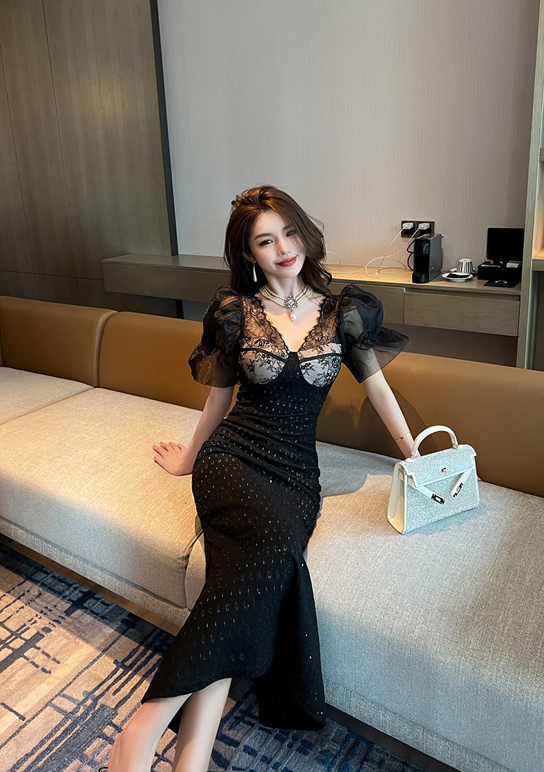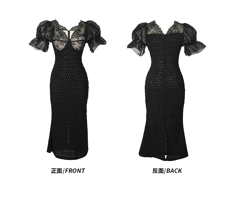 華やかなパーティーシーンを彩る黒ドレスのロング丈デザインです。