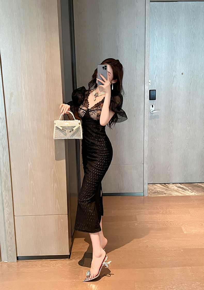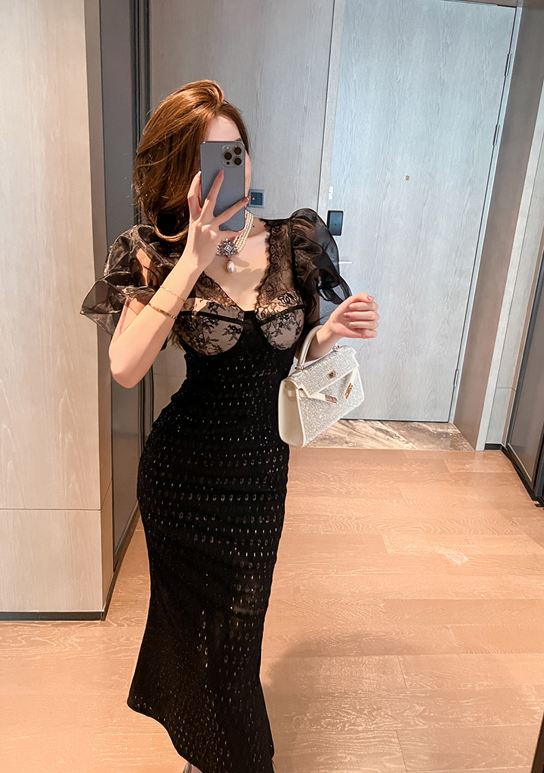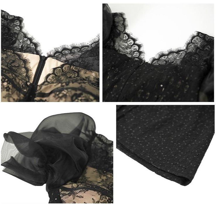 胸元の美しいレース装飾と透け感のある素材が上品で洗練された印象を演出