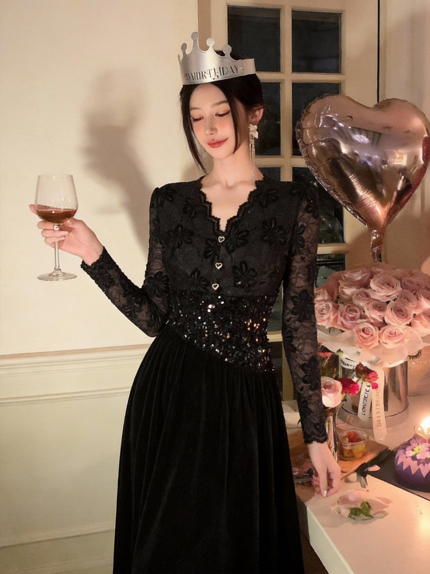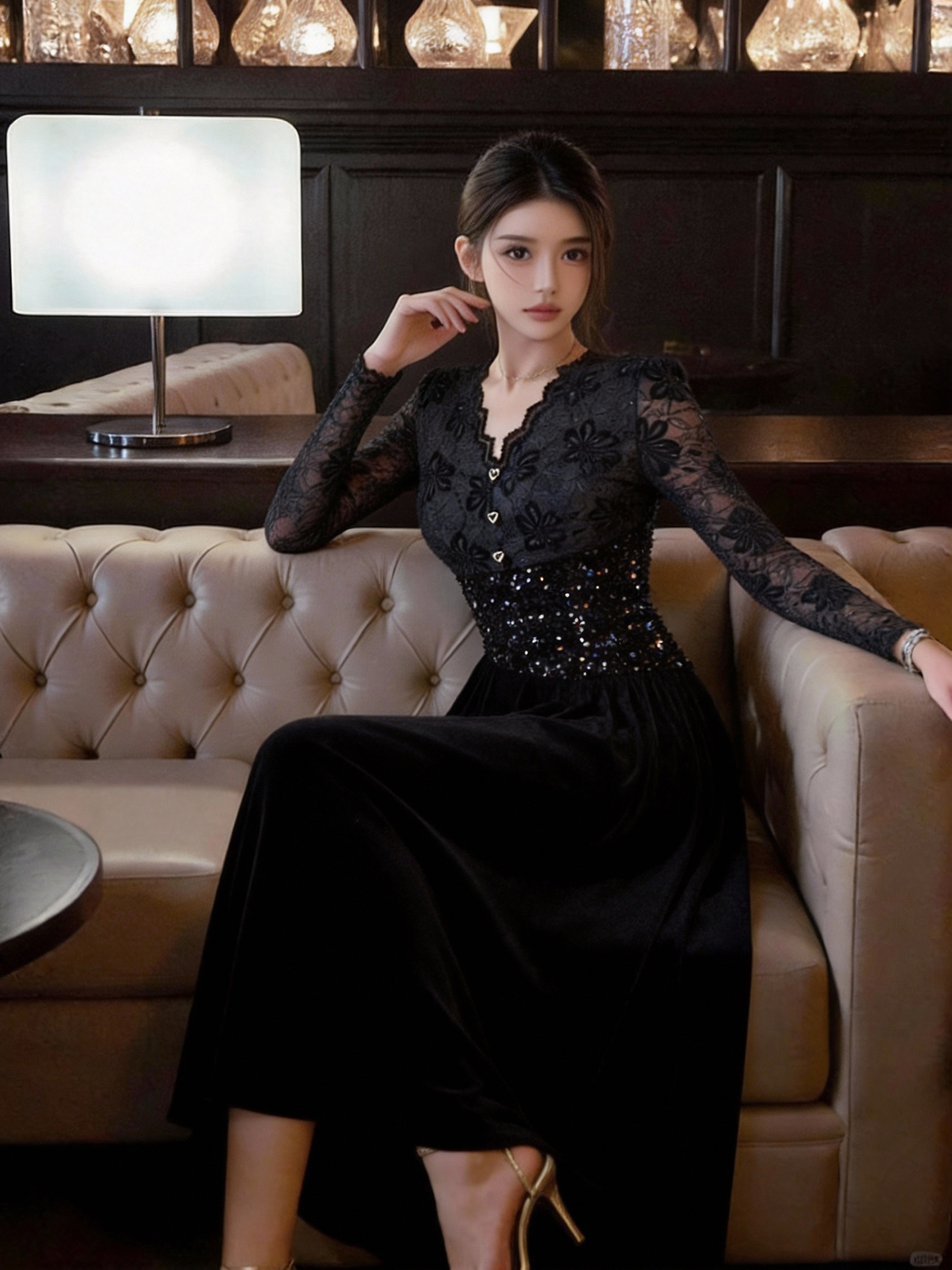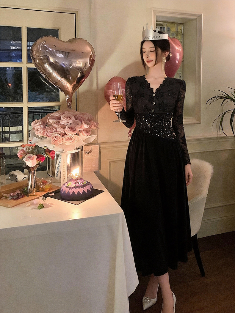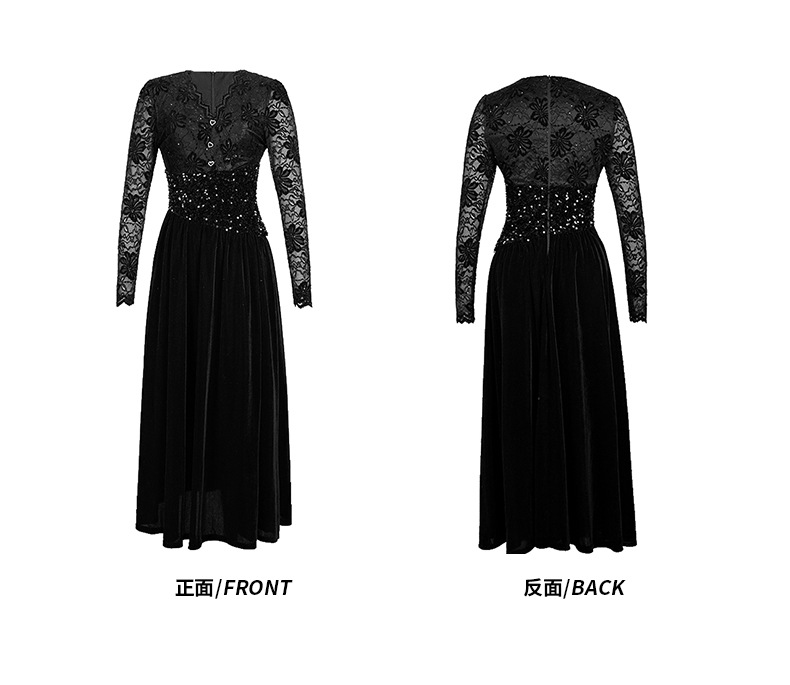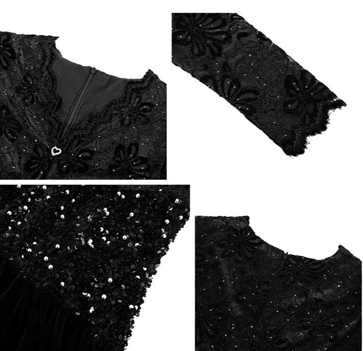 繊細な花柄レースの長袖と、ウエストを華やかに彩るスパンコール装飾が美しい黒ドレスです。