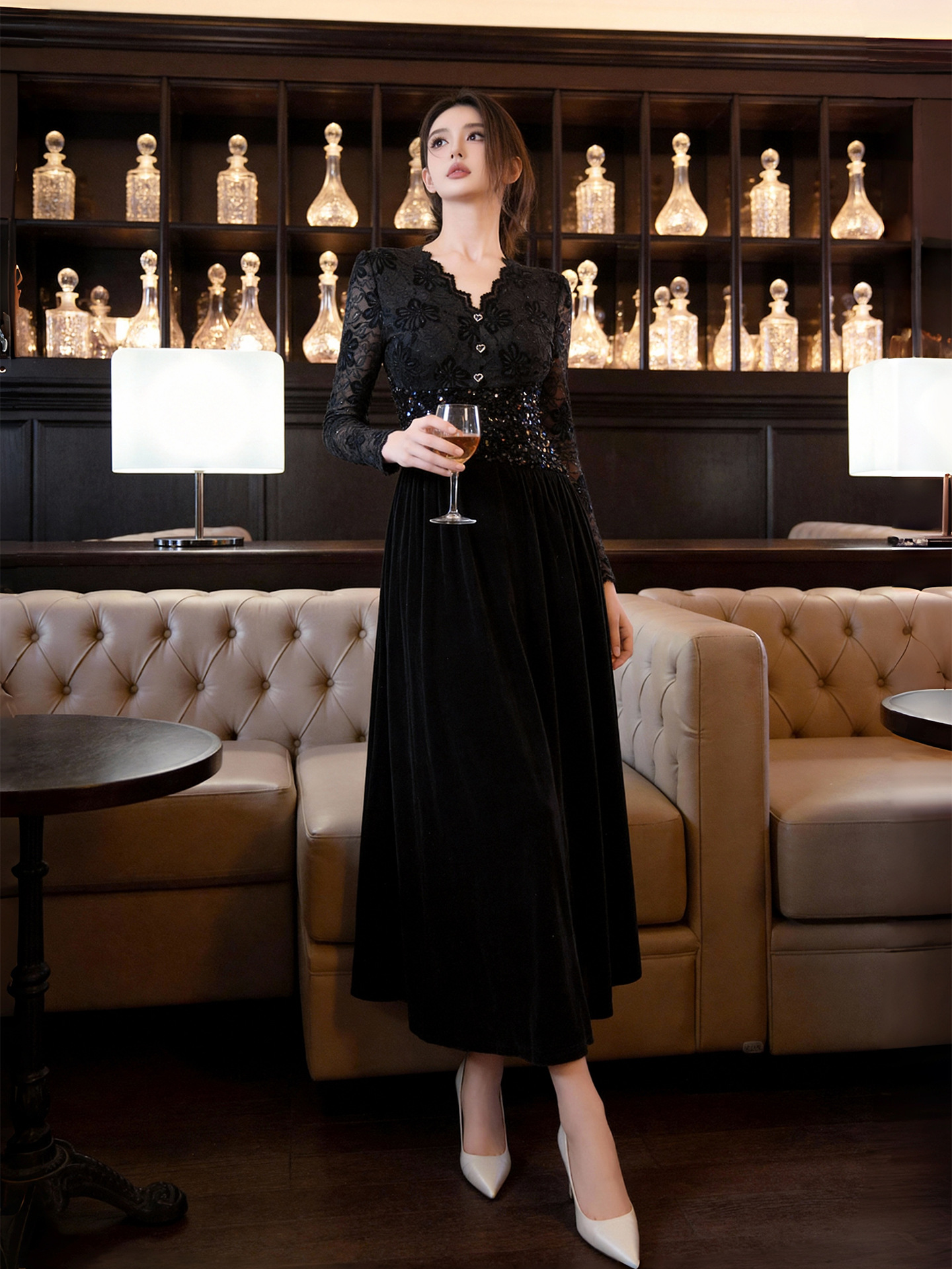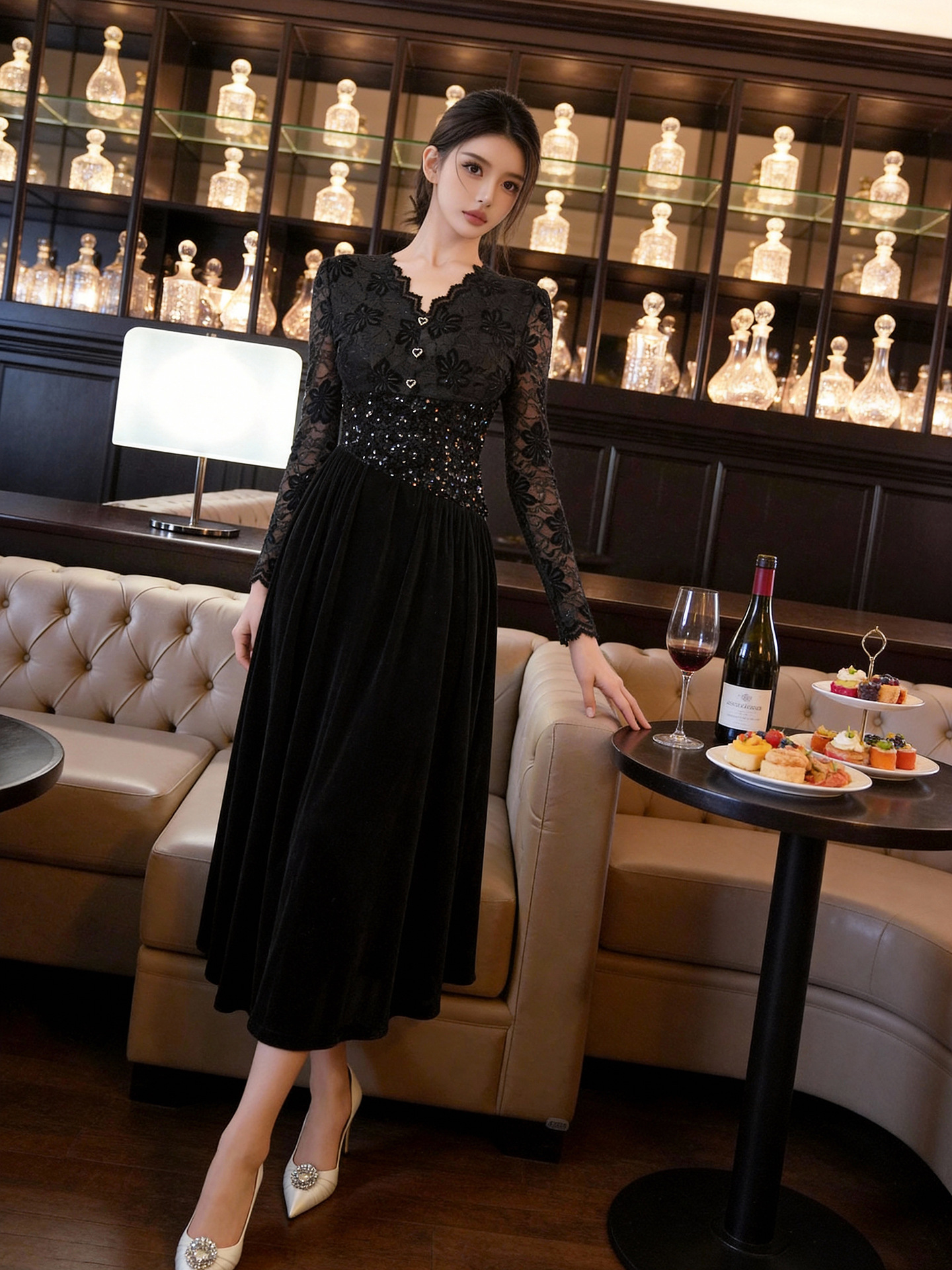 スカート部分は高級感のあるベルベット素材で、深みのある質感が大人っぽい雰囲気を作り出す