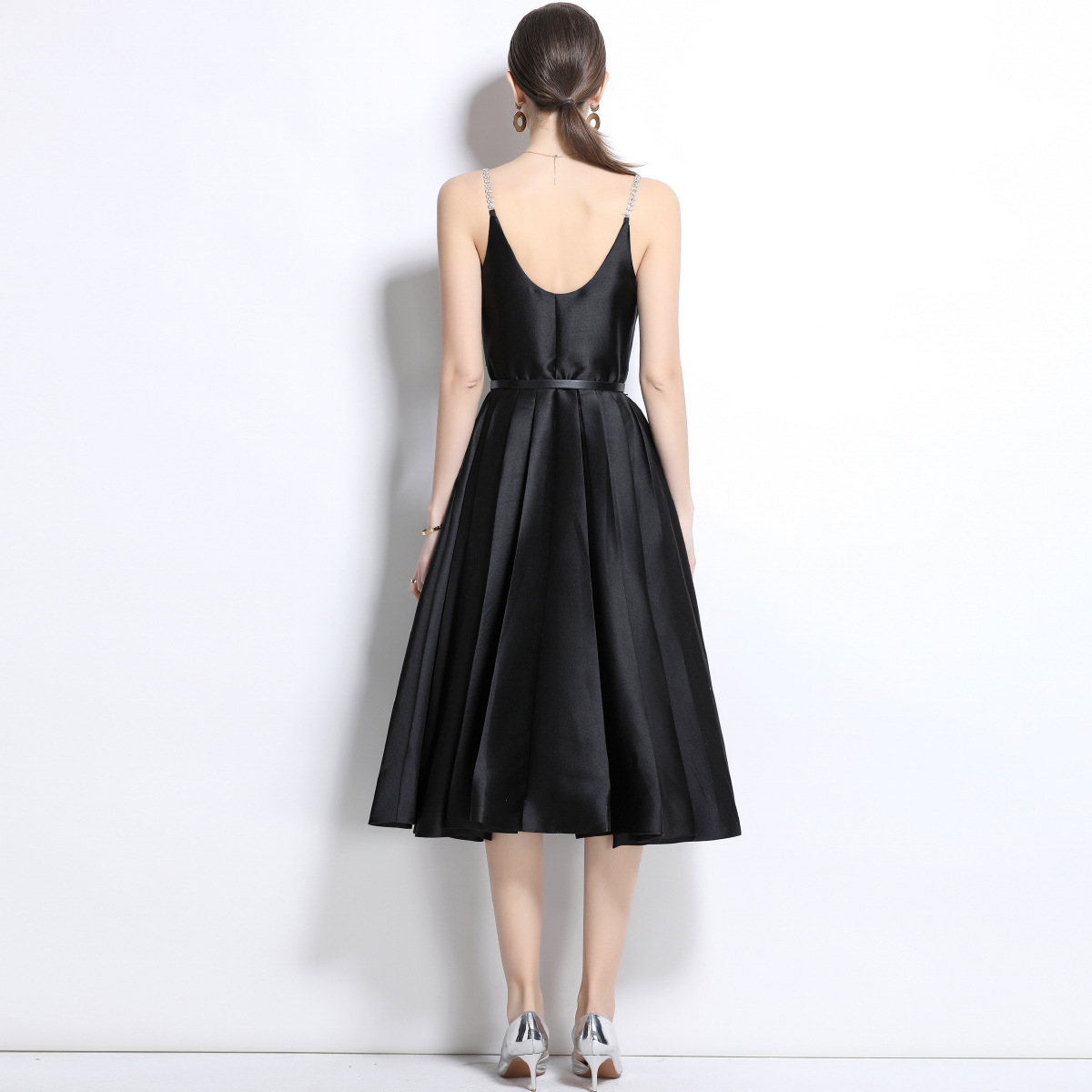 上品な光沢を放つ生地を使用したミニ丈の黒ドレス。クリスタルのように輝くストラップと、フロントのデコラティブなボタンが独自の魅力を引き立てる。贅沢なプリーツスカートが優雅な動きを演出し、洗練されたスタイルを実現。特別な日やパーティーにぴったりな一着。シンプルでありながら存在感のあるデザインが、あなたの魅力を引き出す。