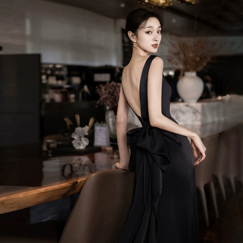 深いVネックと大胆な背中開きデザインが魅力的なパーティードレス。